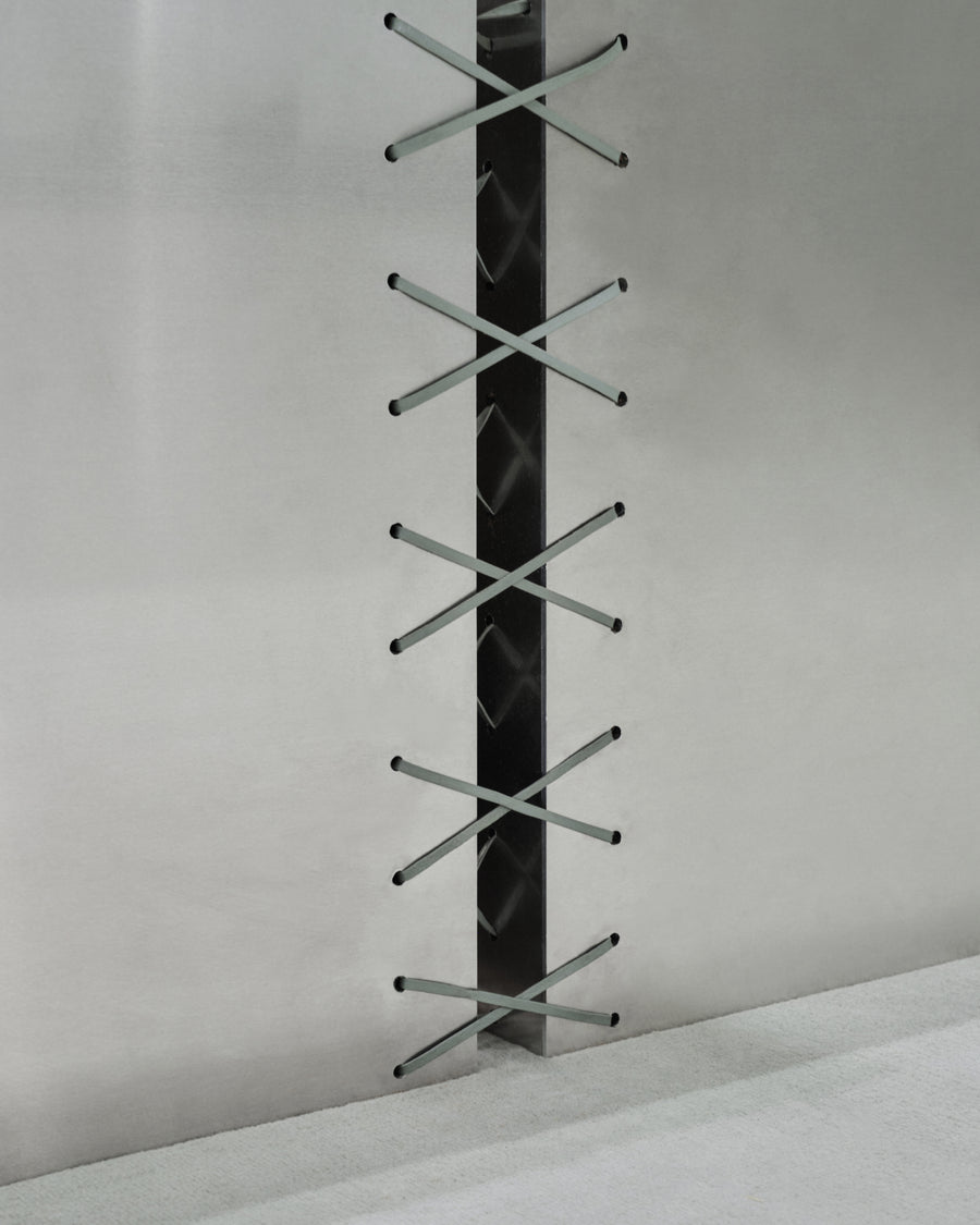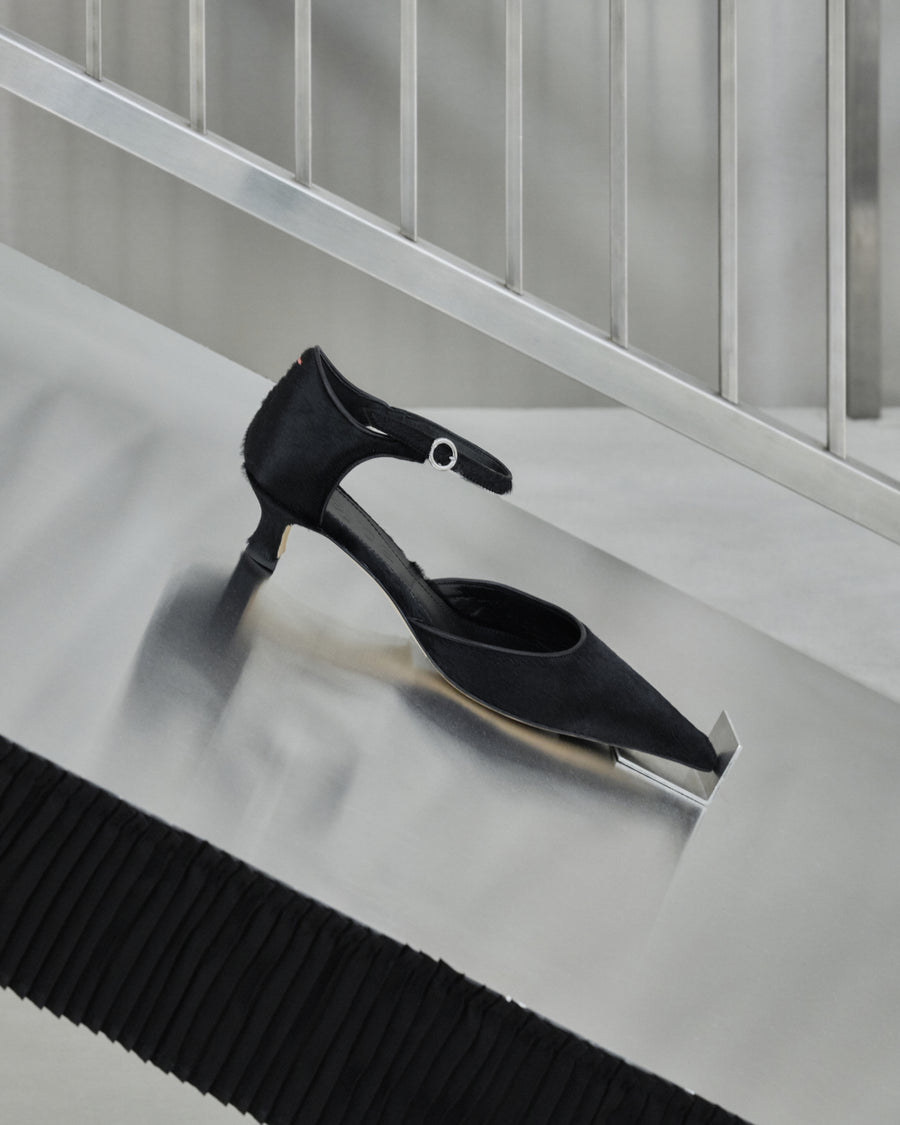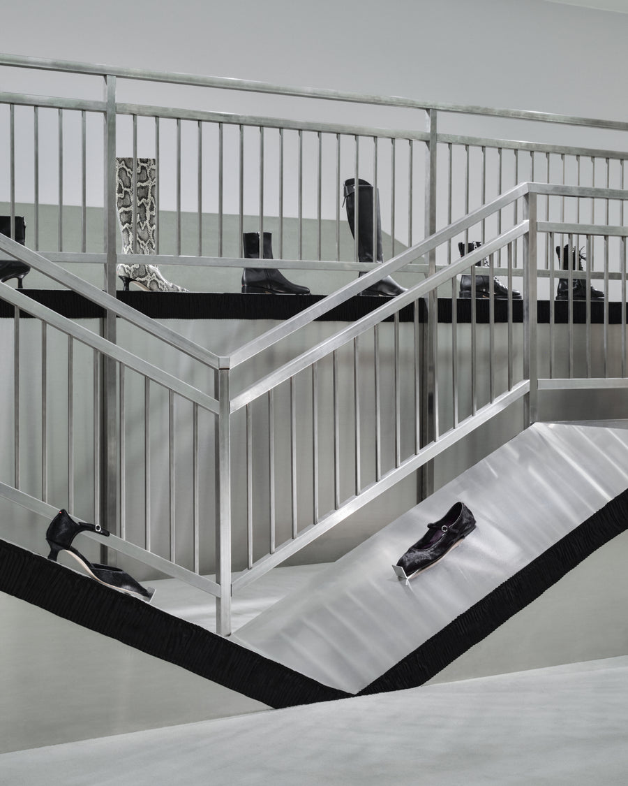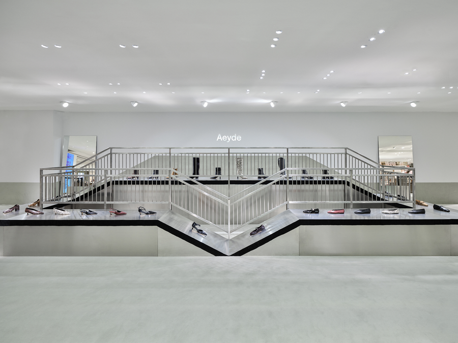 The pop-up installation extends Aeyde’s design language into the physical space. Inspired by Modernist and Brutalist architecture, the setting pairs metal displays with leather-threaded benches, carpeted walls, and ruched fabrics. At its center, a staircase-inspired feature creates a sculptural focal point around which the collection unfolds.