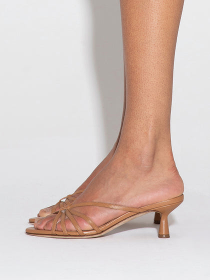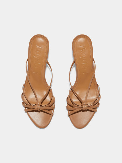 Abby is a refined take on the strappy mule, set on Aeyde’s signature hourglass heel. With a round-toe silhouette, its delicate straps elegantly frame the foot for a minimal yet striking look.