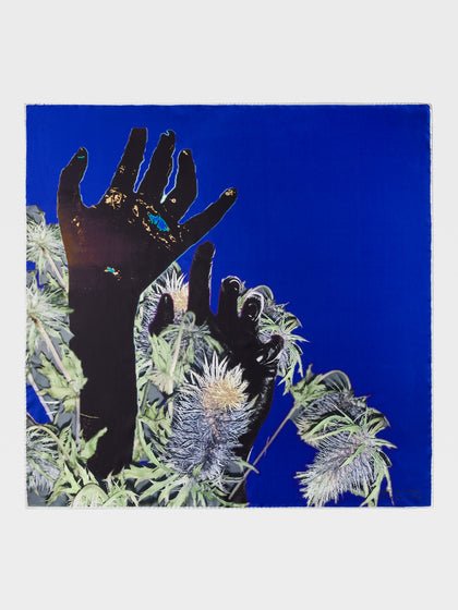 Silk twill scarf with custom artwork by Berlin-based artist Aino Laberenz. The artist's hands, clad in black patent leather gloves, emerge from sharp thistles into bright violet blue. Hand printed on premium silk in a limited edition as part of the aeyde Collectables series. Made in Italy.