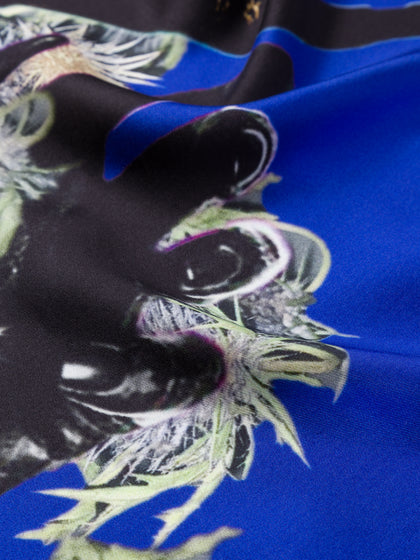 Silk twill scarf with custom artwork by Berlin-based artist Aino Laberenz. The artist's hands, clad in black patent leather gloves, emerge from sharp thistles into bright violet blue. Hand printed on premium silk in a limited edition as part of the aeyde Collectables series. Made in Italy.