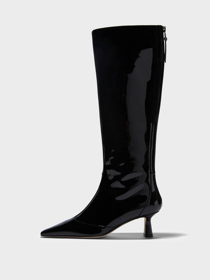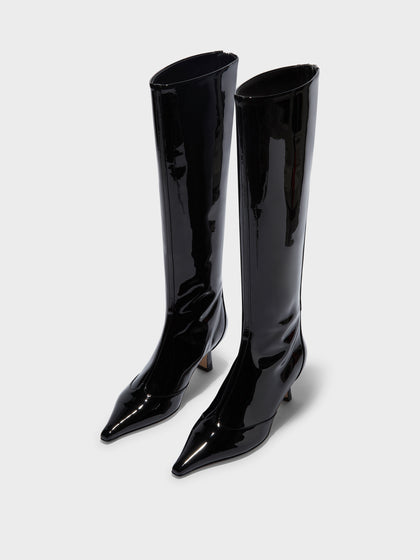 Alexis is our tall, pointed-toe boot defined by a T-Bar detail, crafted from patent leather and finished with layered details that nod to trompe l'oeil techniques.