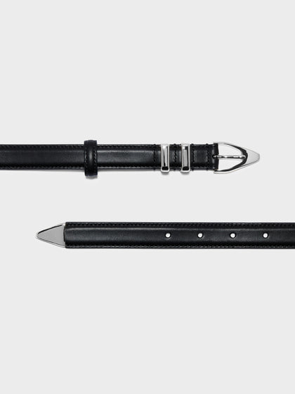 Avia is narrow belt crafted from durable leather, accented by an A-shaped buckle and matching end cap.