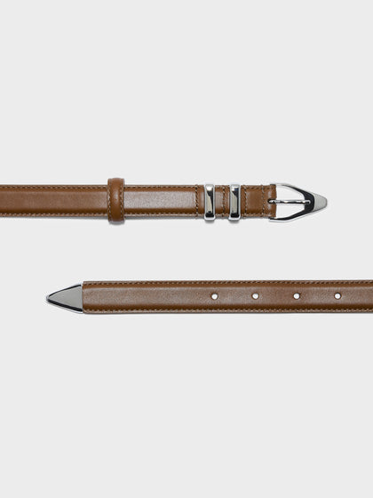 Avia is narrow belt crafted from durable leather, accented by an A-shaped buckle and matching end cap.