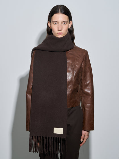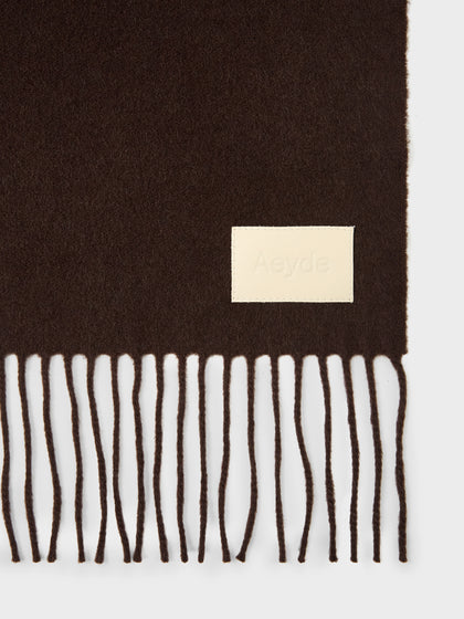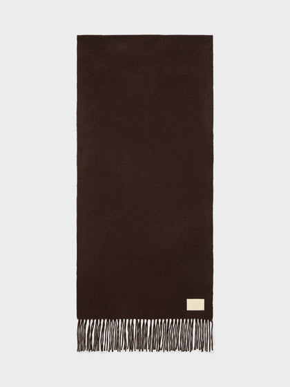 Bela is Aeyde's classic scarf, made from soft cashmere with fringe detailing and a brand-embossed leather label.
