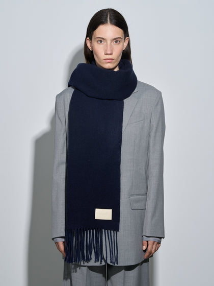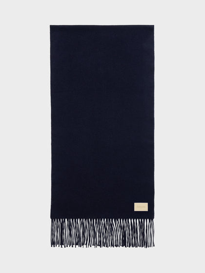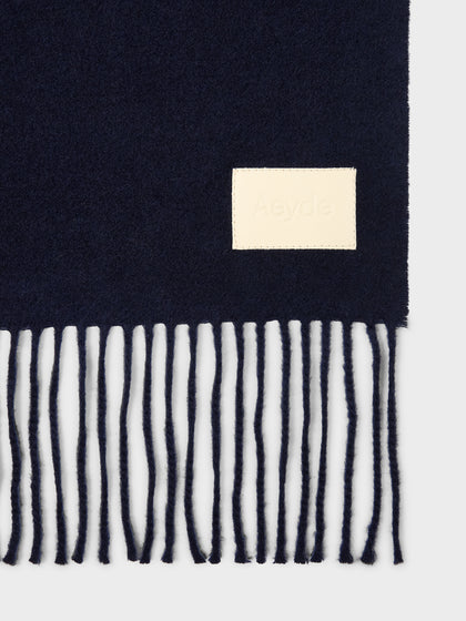 Bela is Aeyde's classic scarf, made from soft cashmere with fringe detailing and a brand-embossed leather label.