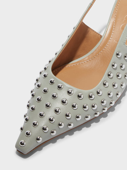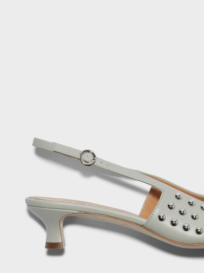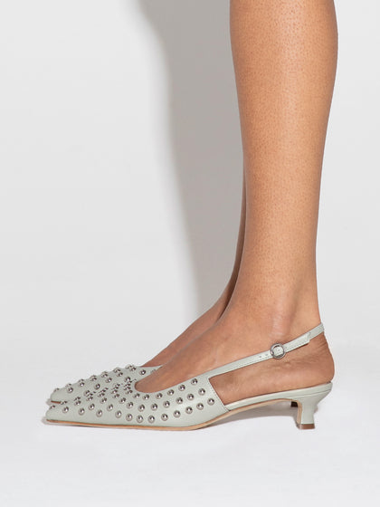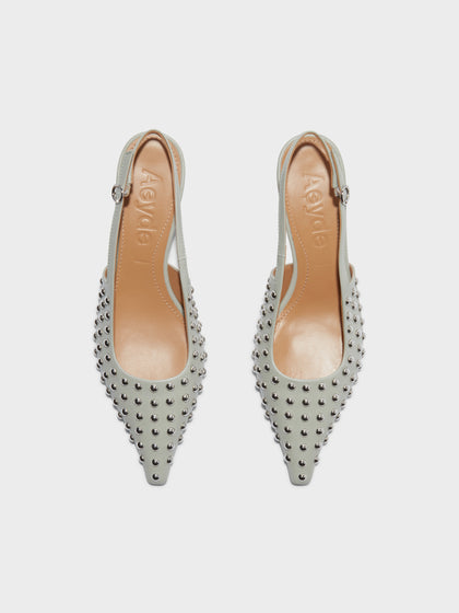 Catrina is Aeyde's elegant chisel-toe pump with tapered kitten heels, adjustable slingback straps, and bespoke anti-slip soles—finished with stud detailing that contrasts with the shoe’s graceful silhouette.
