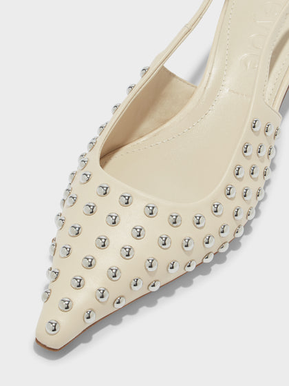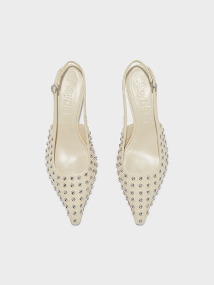 Catrina is Aeyde's elegant chisel-toe pump with tapered kitten heels, adjustable slingback straps, and bespoke anti-slip soles—finished with stud detailing that contrasts with the shoe’s graceful silhouette.