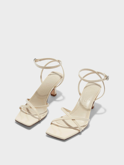 Edith brings a dose of drama, balancing fine, overlapping straps with a strong heel and square toe. A sharp silhouette meets high-shine patent leather.
