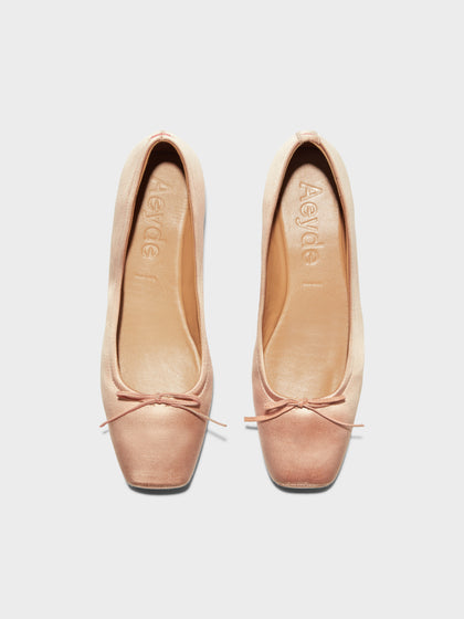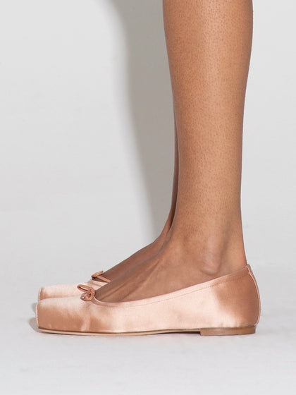 In timeless peach satin, the Gabriella ballet flats are an elevated version of traditional balletic styles. These foldable flats are constructed with dramatic square toes and crafted using the traditional sacchetto method–ensuring increased comfort and flexibility.