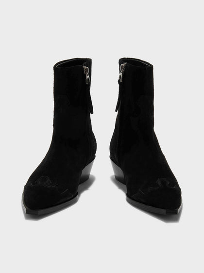Hester is Aeyde's contemporary take on cowboy ankle boots. This Western-inspired style features a layered design, pointed toes, and tapered, robust heels.