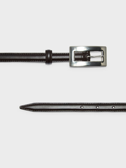 Noya is a narrow belt crafted from supple leather and secured with a chunky, rectangular buckle.