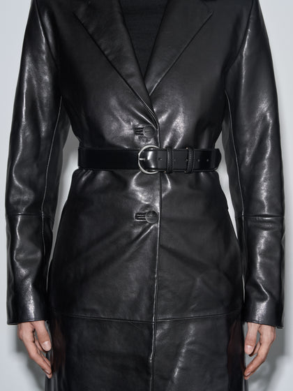 Rene is a thick, understated belt featuring our signature round buckle, crafted from polished calfskin leather with a subtle sheen.