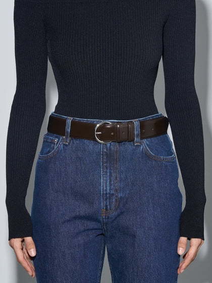 Rene is a thick, understated belt featuring our signature round buckle, crafted from polished calfskin leather with a subtle sheen.