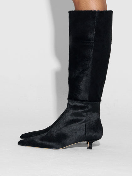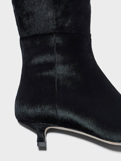 Sabrina is a fitted boot balanced on a delicate kitten heel, crafted in tactile pony hair and finished with a pointed toe for a touch of elegance.