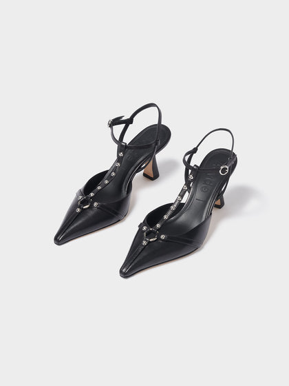 The Saskia pumps are a modern take on ‘90s staples–the most influential style era for Aeyde. This T-bar pair is crafted from nappa leather and completed with pointed toes and embellished with a smattering of directional hardware.