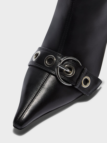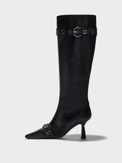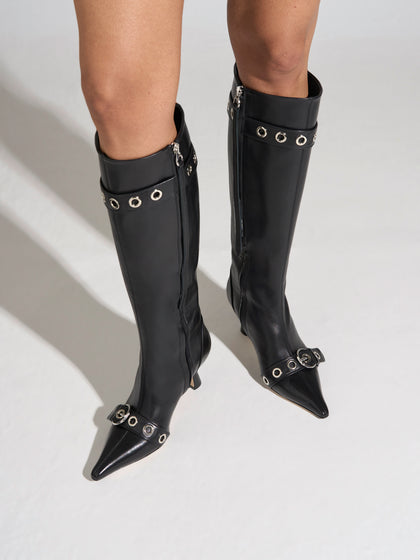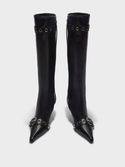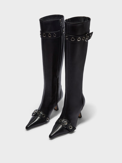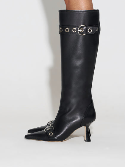 Vivian takes cues from early '00s design. The pointed-toe knee-high boot is elevated with double eyelet-studded detail, signature Aeyde buckle, and sculpted heel.